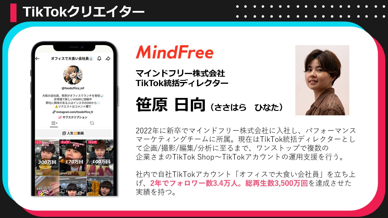 日本のTikTok Shop市場は急速に拡大しており、参入のチャンスである一方、競争も日に日に激化しています。マインドフリー株式会社は、「まず何から始めればよいかわからない」という事業者から、「すでに運用しているが成果が伸び悩んでいる」という事業者まで、幅広いニーズに応えられる支援体制を整え、日本のTikTok Shopマーケティングの発展に貢献してまいります。