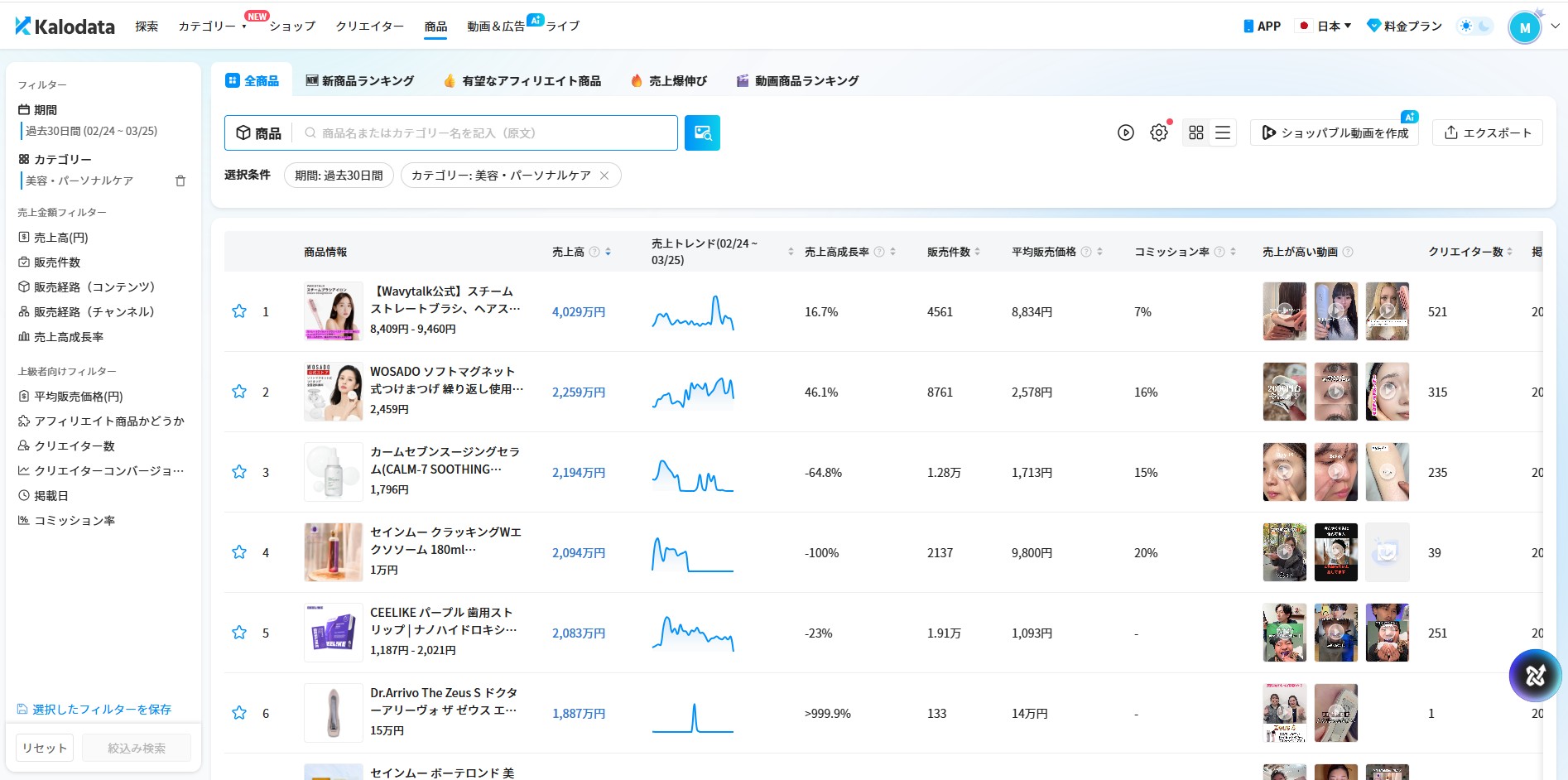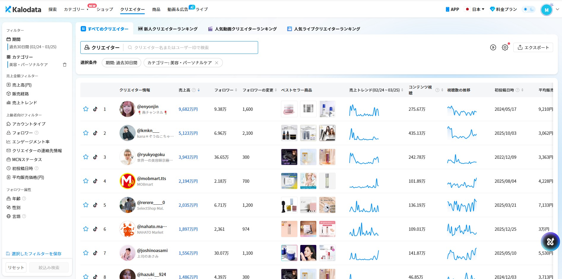 「Kalodata」は世界200万人以上のユーザーに利用されるTikTok Shop特化のデータプラットフォームです。2億件以上の商品データと2.5億人以上のクリエイターデータをリアルタイムで取得・分析できます。